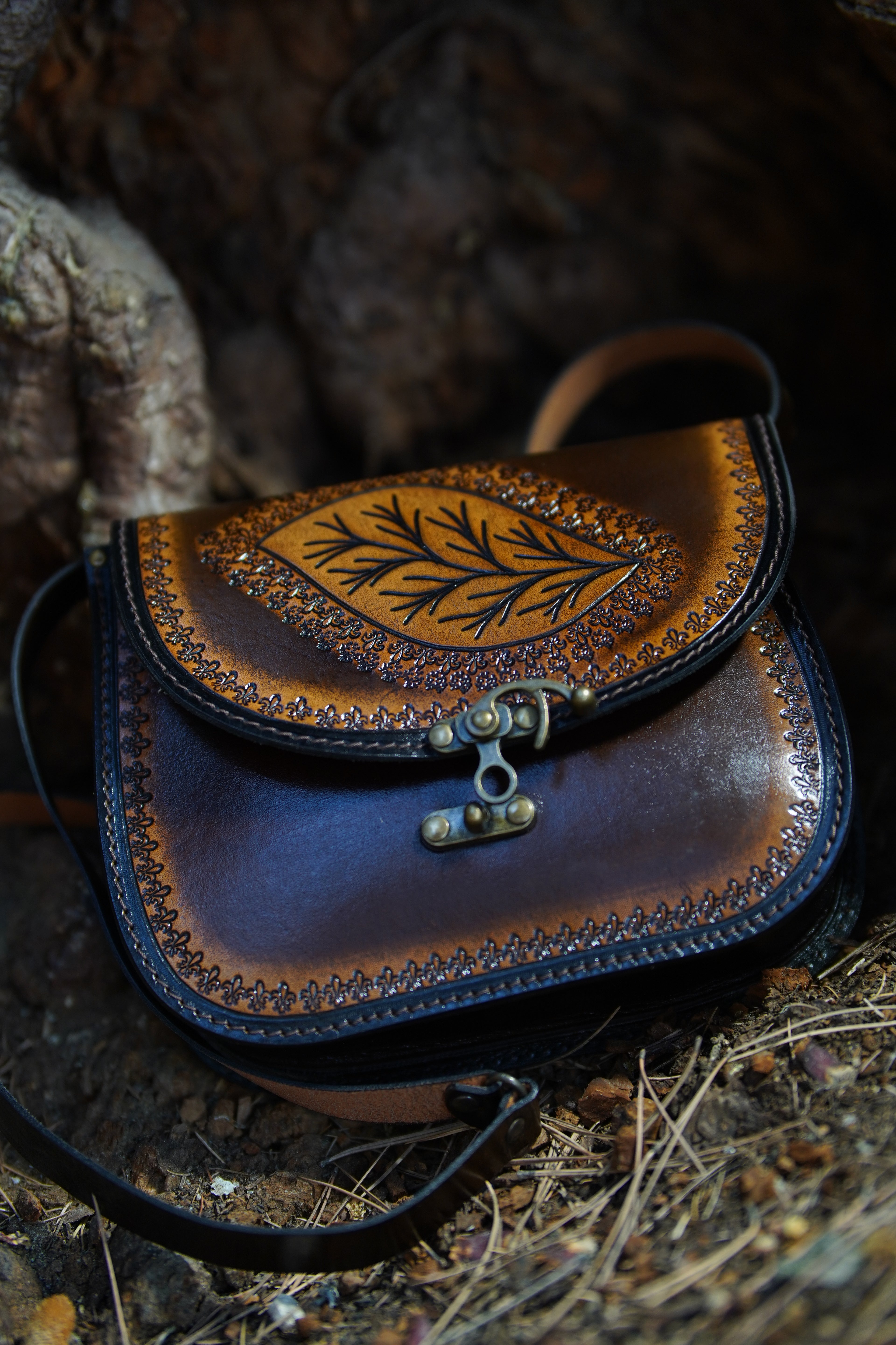 Handcrafted Leather Crossbody Bag – Vintage Brown Embossed Leaf Purse | Boho Rustic Everyday Shoulder Bag