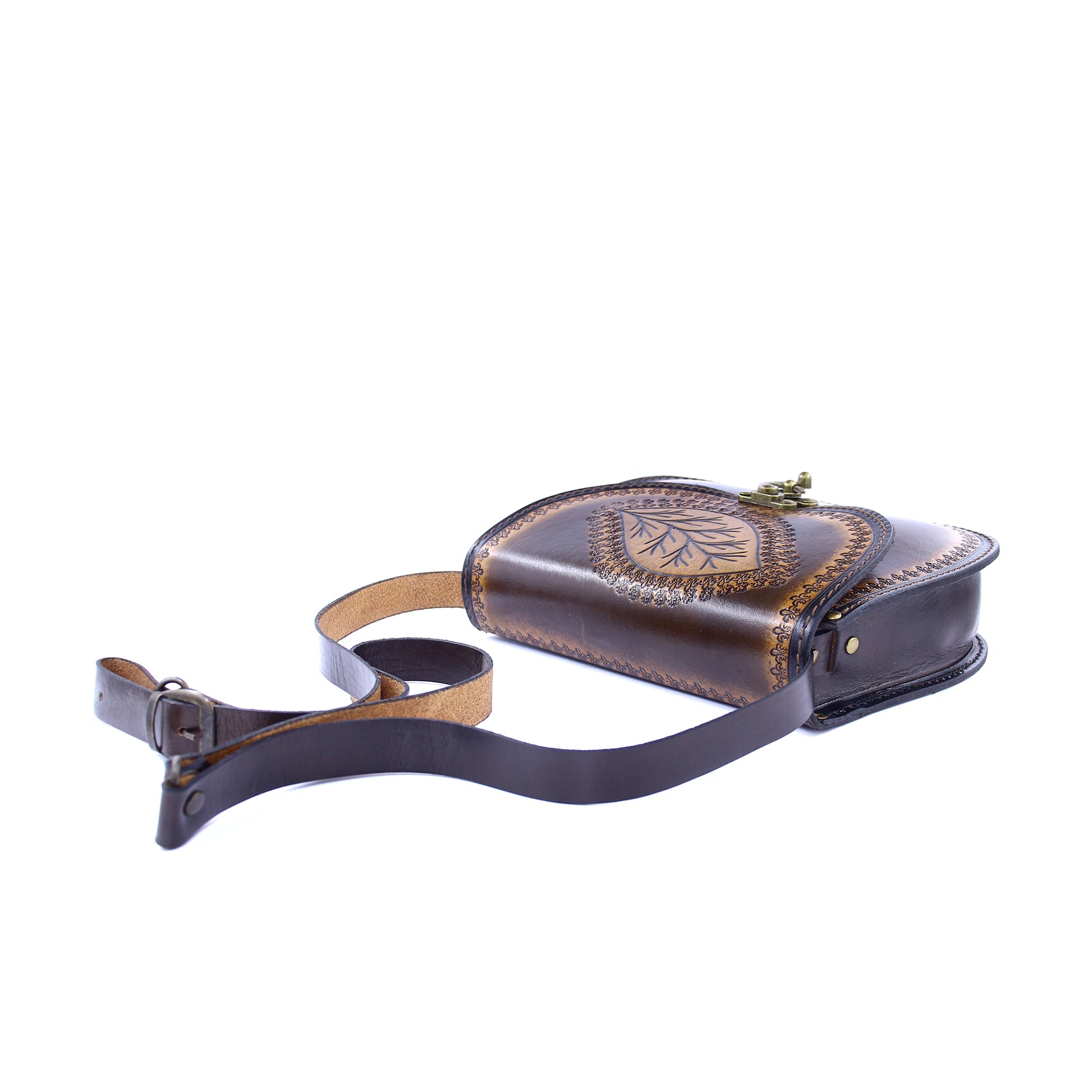Handcrafted Leather Crossbody Bag – Vintage Brown Embossed Leaf Purse | Boho Rustic Everyday Shoulder Bag